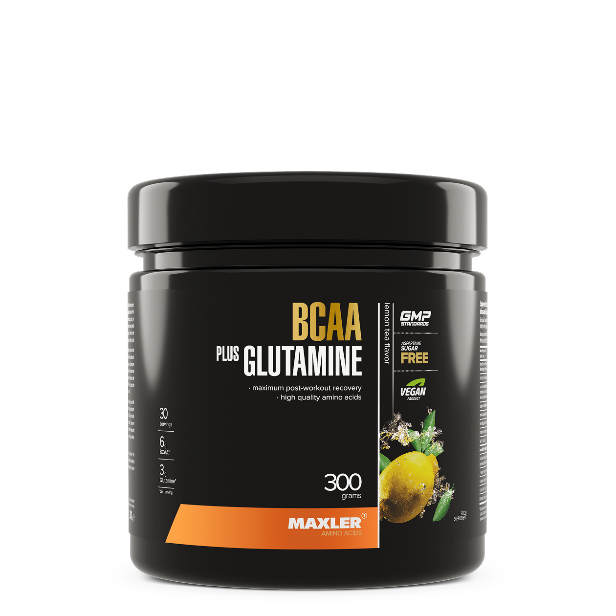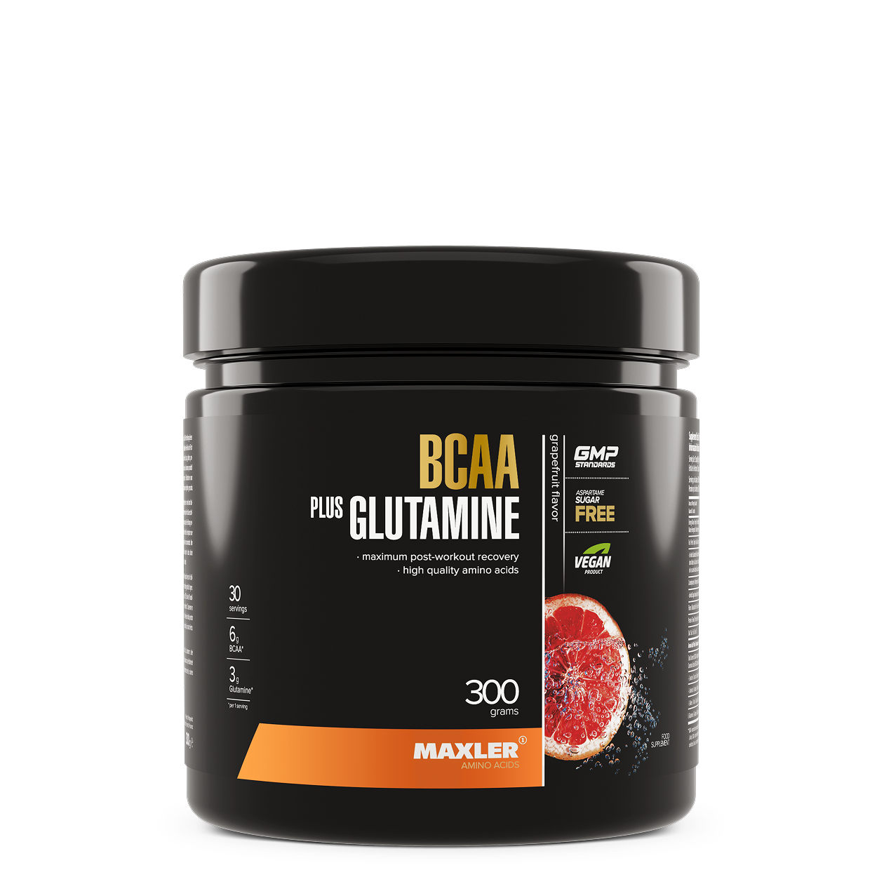 Ingredients: L-Leucine, L-Glutamine, L-Isoleucine, L-Valine, acidity regulator (citric acid), maltodextrin, flavoring, sweeteners (sucralose, acesulfame K), emulsifier (sunflower lecithin), color (beta-carotene).