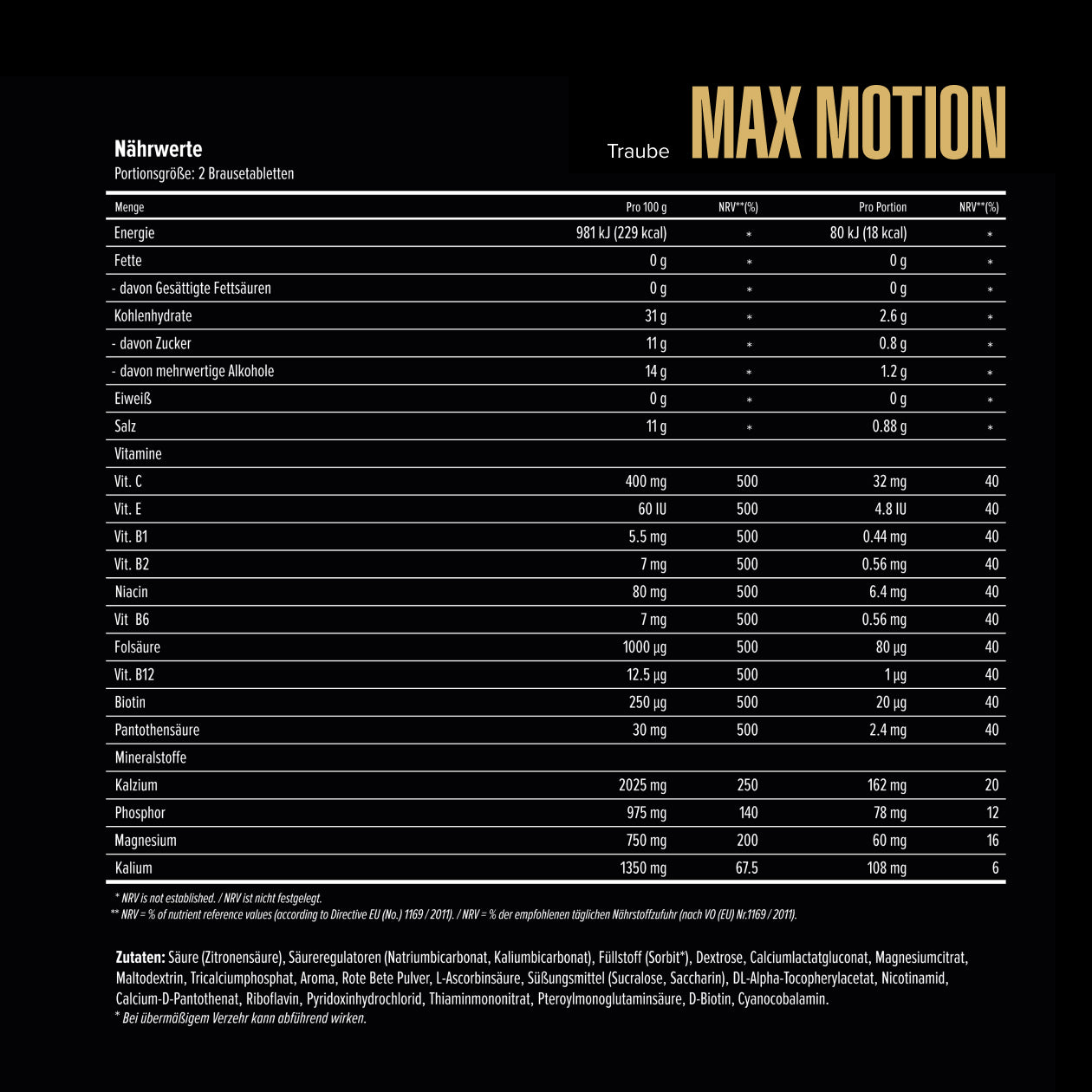 Zutaten: Säure (Zitronensäure), Säureregulatoren (Natriumbicarbonat, Kaliumbicarbonat), Füllstoff (Sorbit), Dextrose, Calciumlactatgluconat, Magnesiumcitrat, Maltodextrin, Tricalciumphosphat, Aroma, Beta-Carotin Pulver, Rote Bete Pulver, L- Ascorbinsäure, Süßstoffe (Sucralose, Saccharin), DL-Alpha-Tocopherylacetat, Nicotinamid, Calcium-D-Pantothenat, Riboflavin, Pyridoxinhydrochlorid, Thiaminmononitrat, Pteroylmonoglutaminsäure, D-Biotin, Cyanocobalamin.