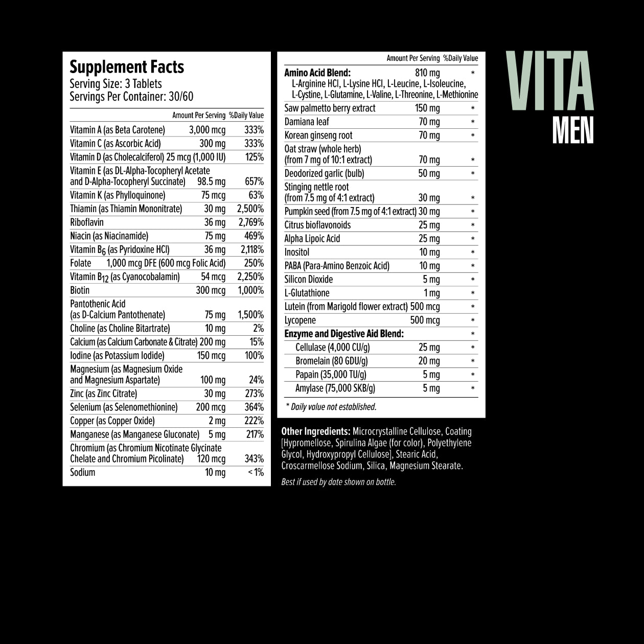 - Building muscle - not only does VitaMen include the vitamins and minerals needed to build muscle, it also includes a blend of amino acids to help you meet your protein goals. Other components like lycopene help increase testosterone levels, which makes it easier to build muscle.
